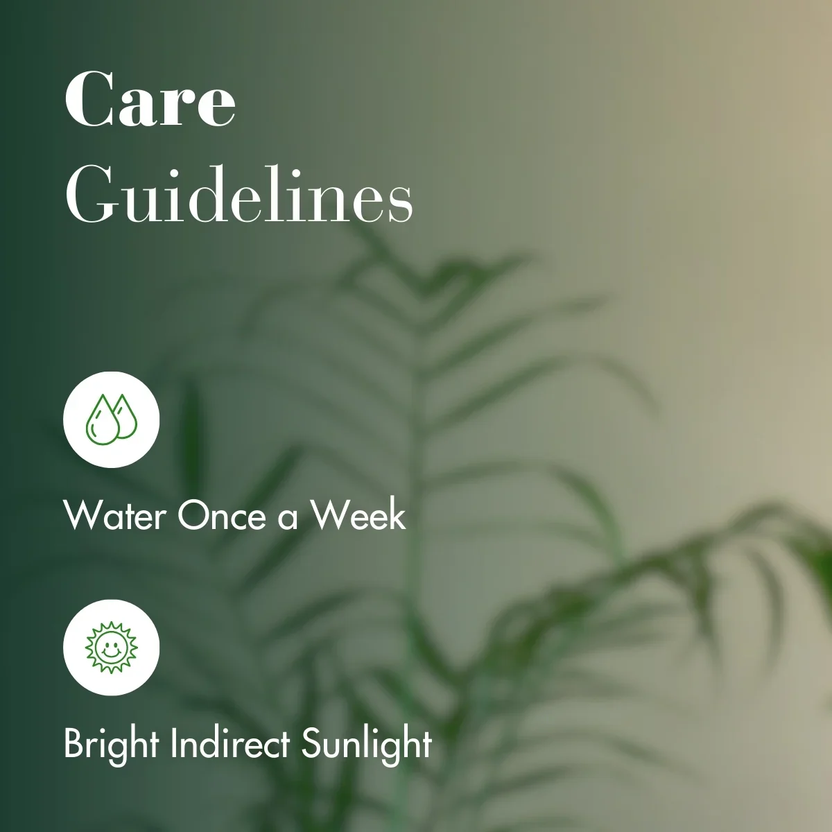 The Areca Palm prefers bright, indirect light and should be watered when the top soil is dry. Keep it in a warm room with good humidity and avoid drafts.