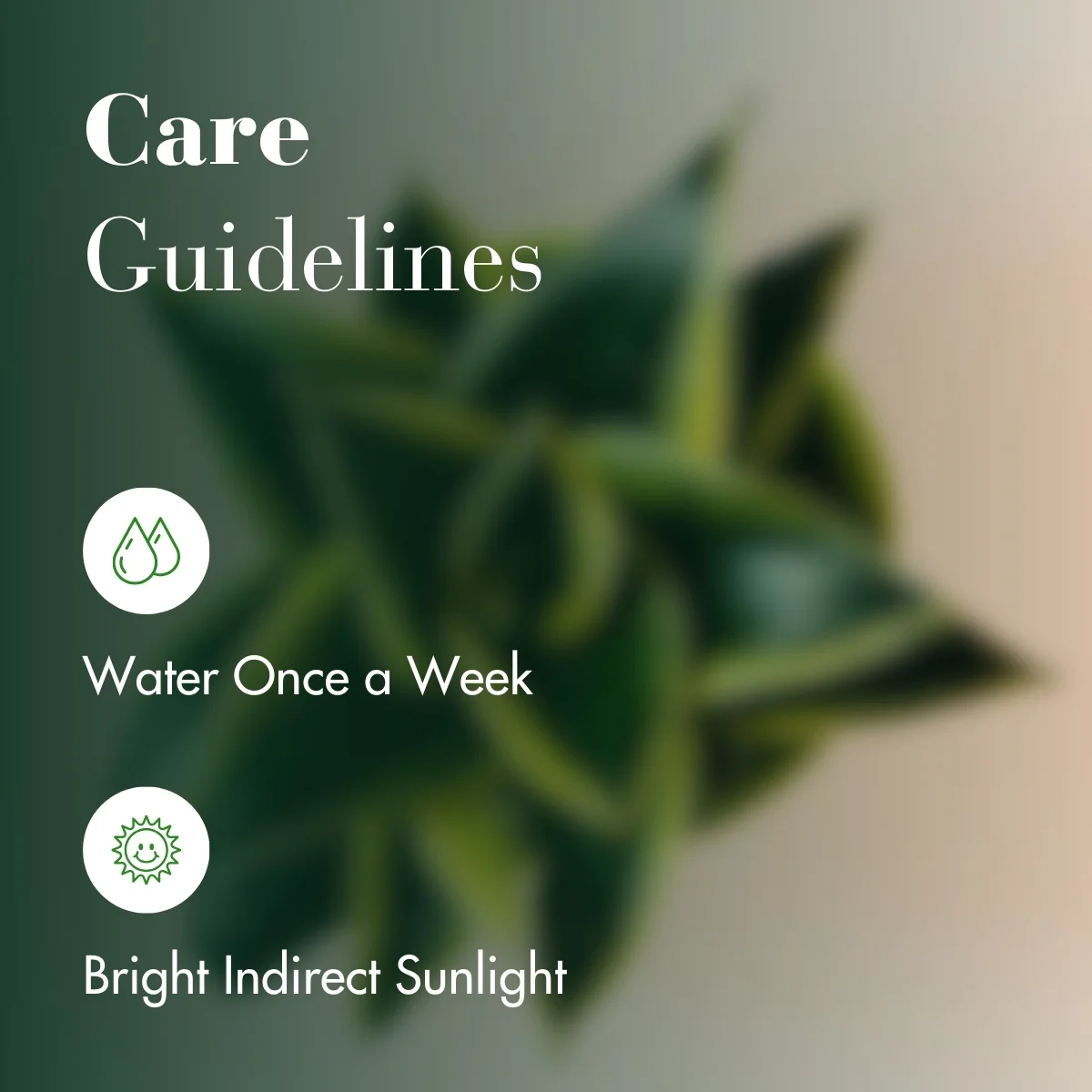 The Snake Plant requires minimal care. Place it in indirect light, water it sparingly when the soil is dry, and use well-draining soil. It adapts well to low light, making it perfect for indoor spaces.